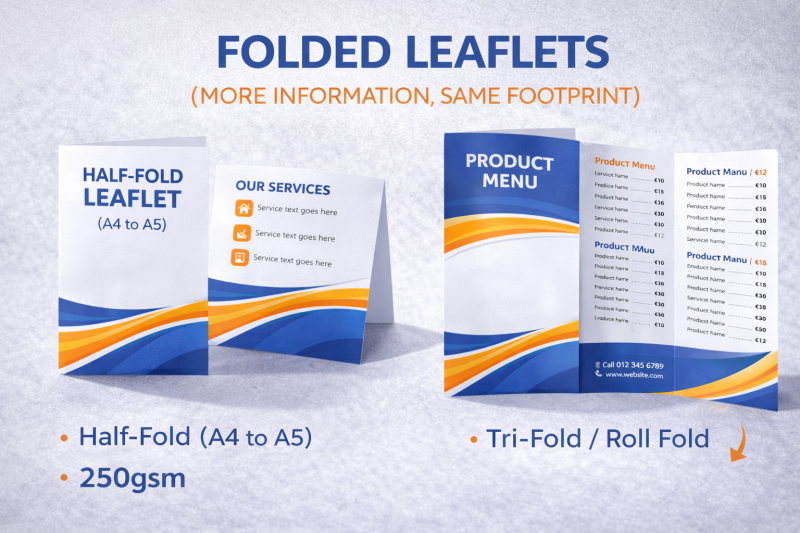 If you need to include more detail without moving to a larger sheet, folded leaflets are a practical option. Common folds include: